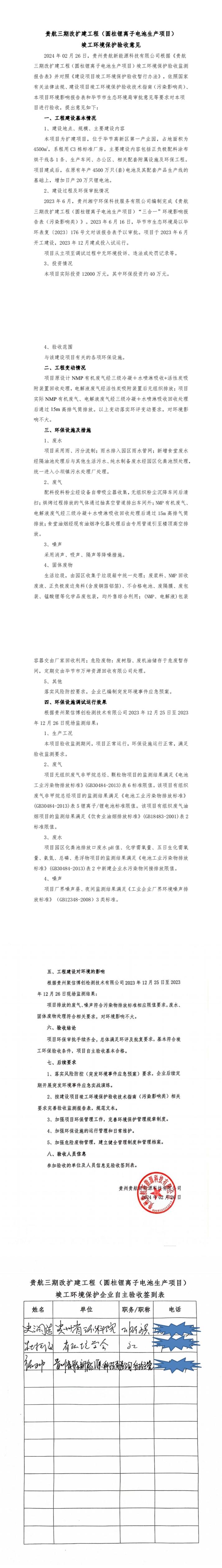 根据《国务院关于修改<建设项目竣工环境保护管理条例>的决定》(国务院令第682号),以及环保部《关于发布<建设项目竣工环境保护保护验收暂行办法>的公告》(国环规环评[2017]4号),现将《贵航三期改扩建工程(圆柱锂离子电池生产项目)竣工环境保护验收监测报告表》公示如下: