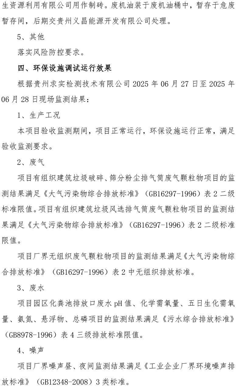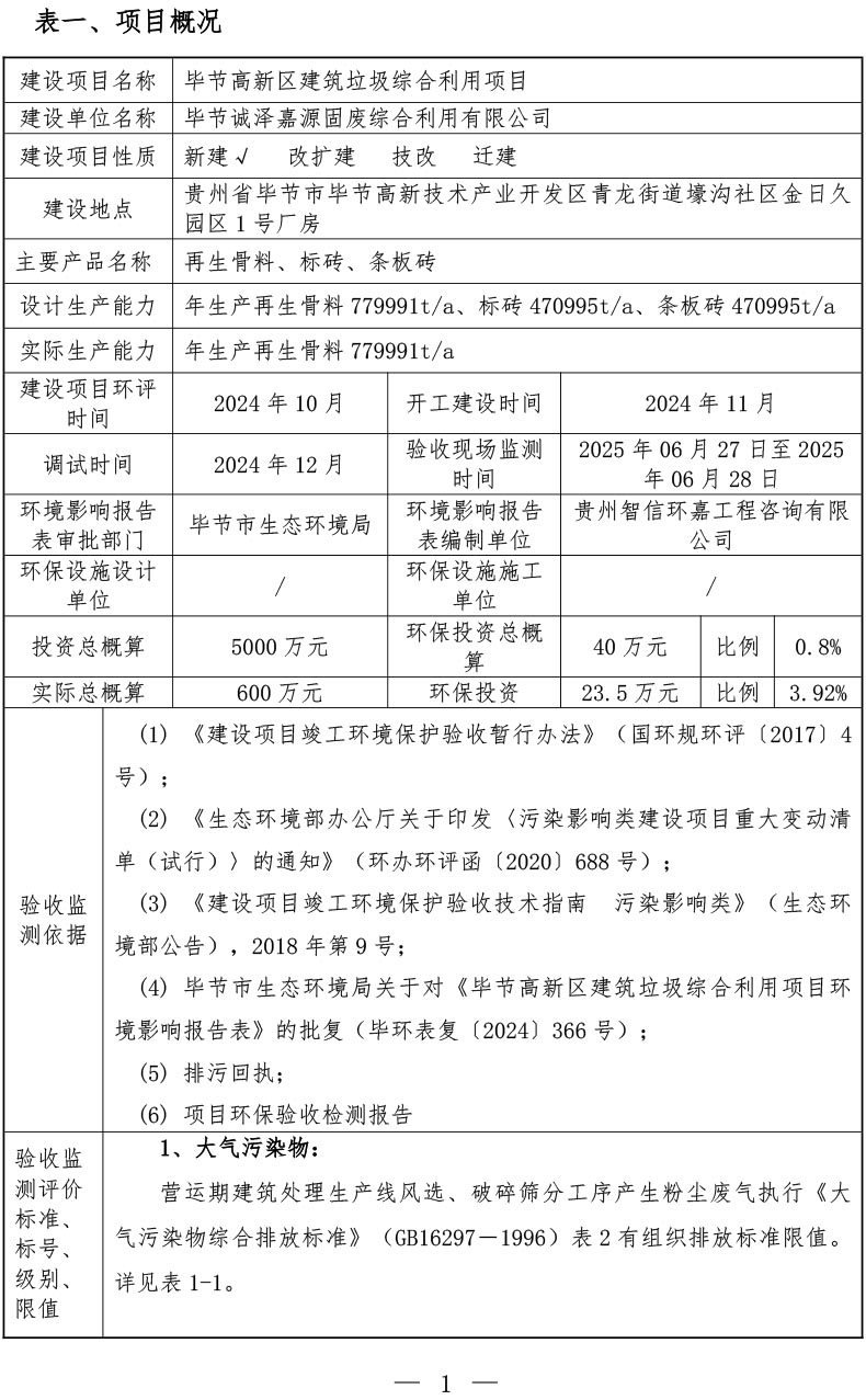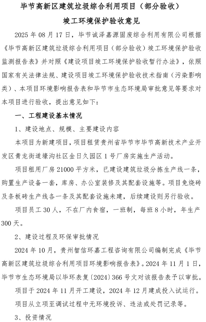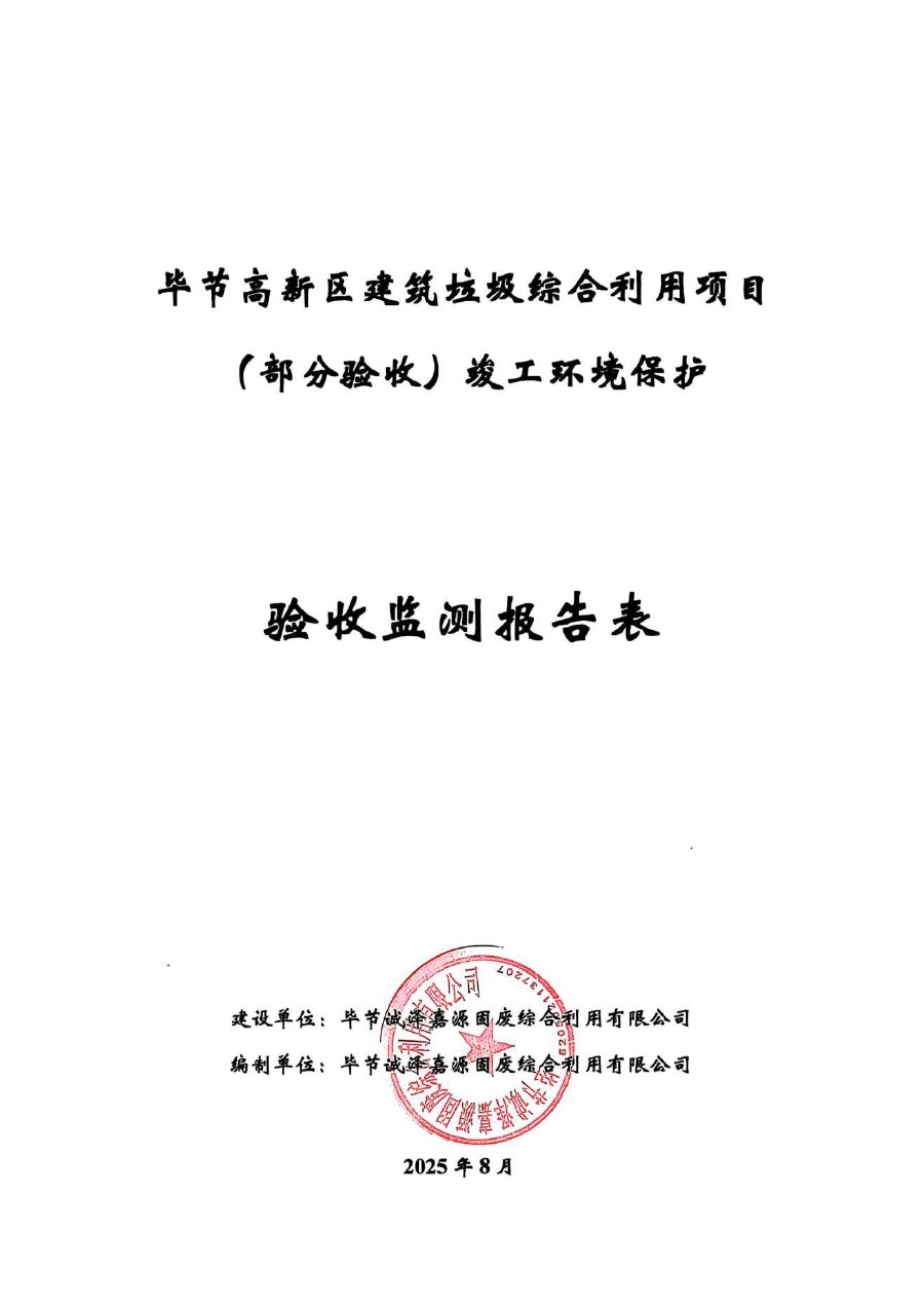 根据《国务院关于修改<建设项目竣工环境保护管理条例>的决定》(国务院令第682号),以及环保部《关于发布<建设项目竣工环境保护保护验收暂行办法>的公告》(国环规环评[2017]4号),现将《毕节高新区建筑垃圾综合利用项目(部分验收)竣工环境保护验收监测报告表》公示如下:
