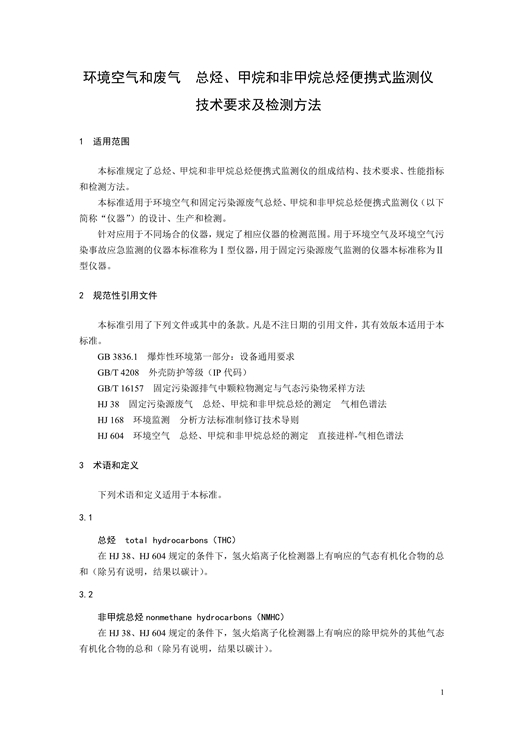 本标准适用于环境空气和固定污染源废气总烃、甲烷和非甲烷总烃便携式监测仪(以下简称“仪器”)的设计、生产和检测。