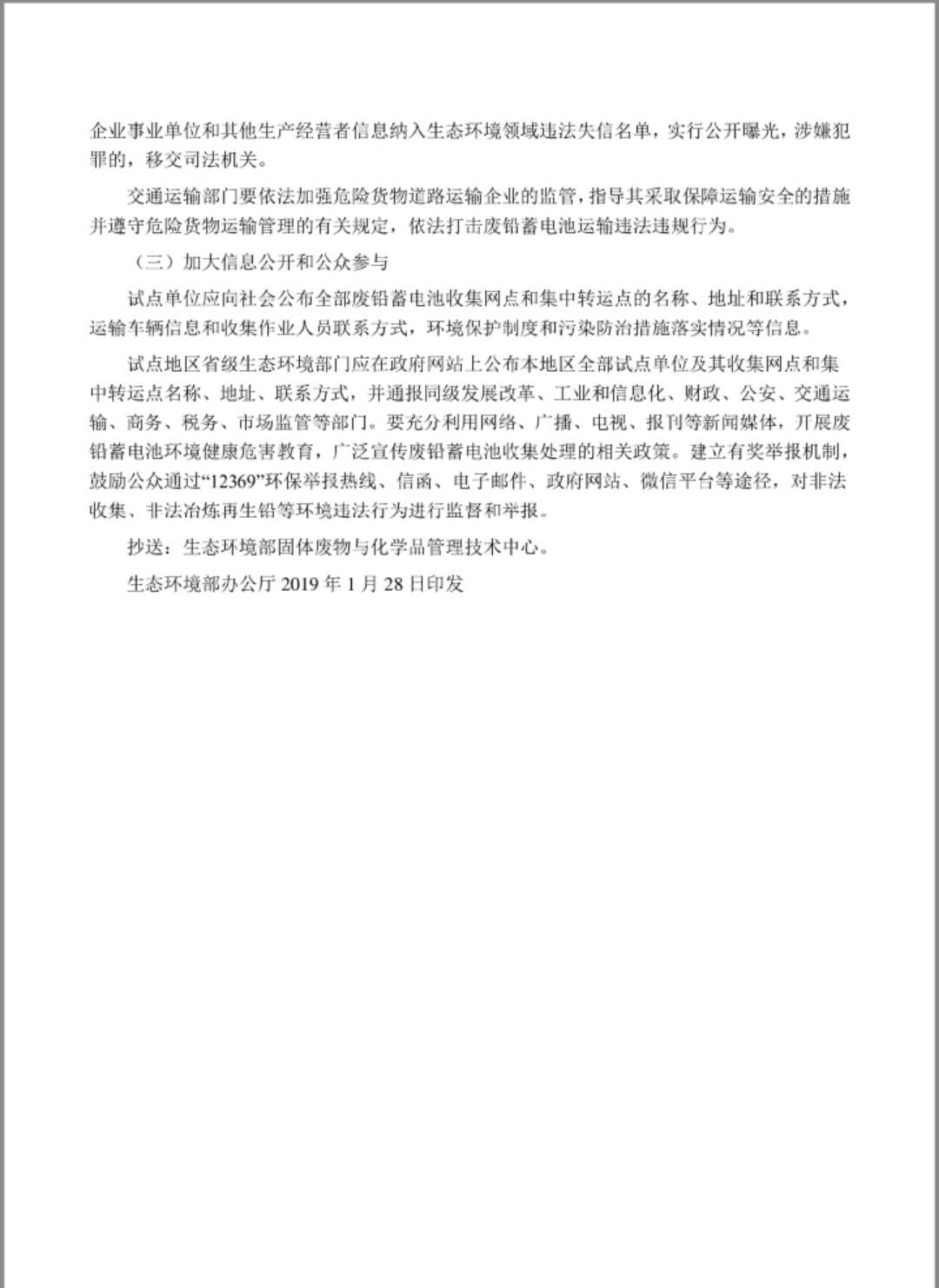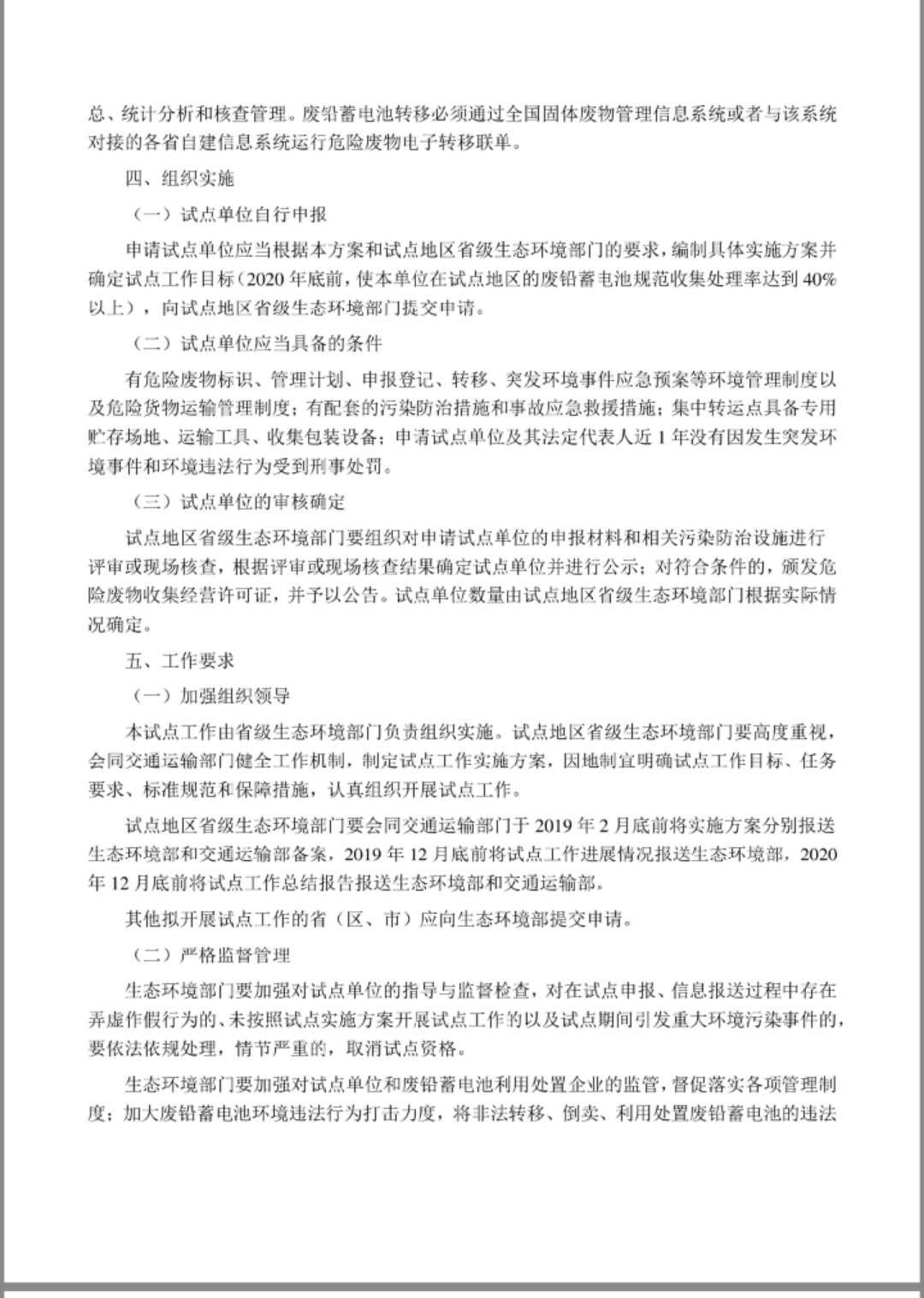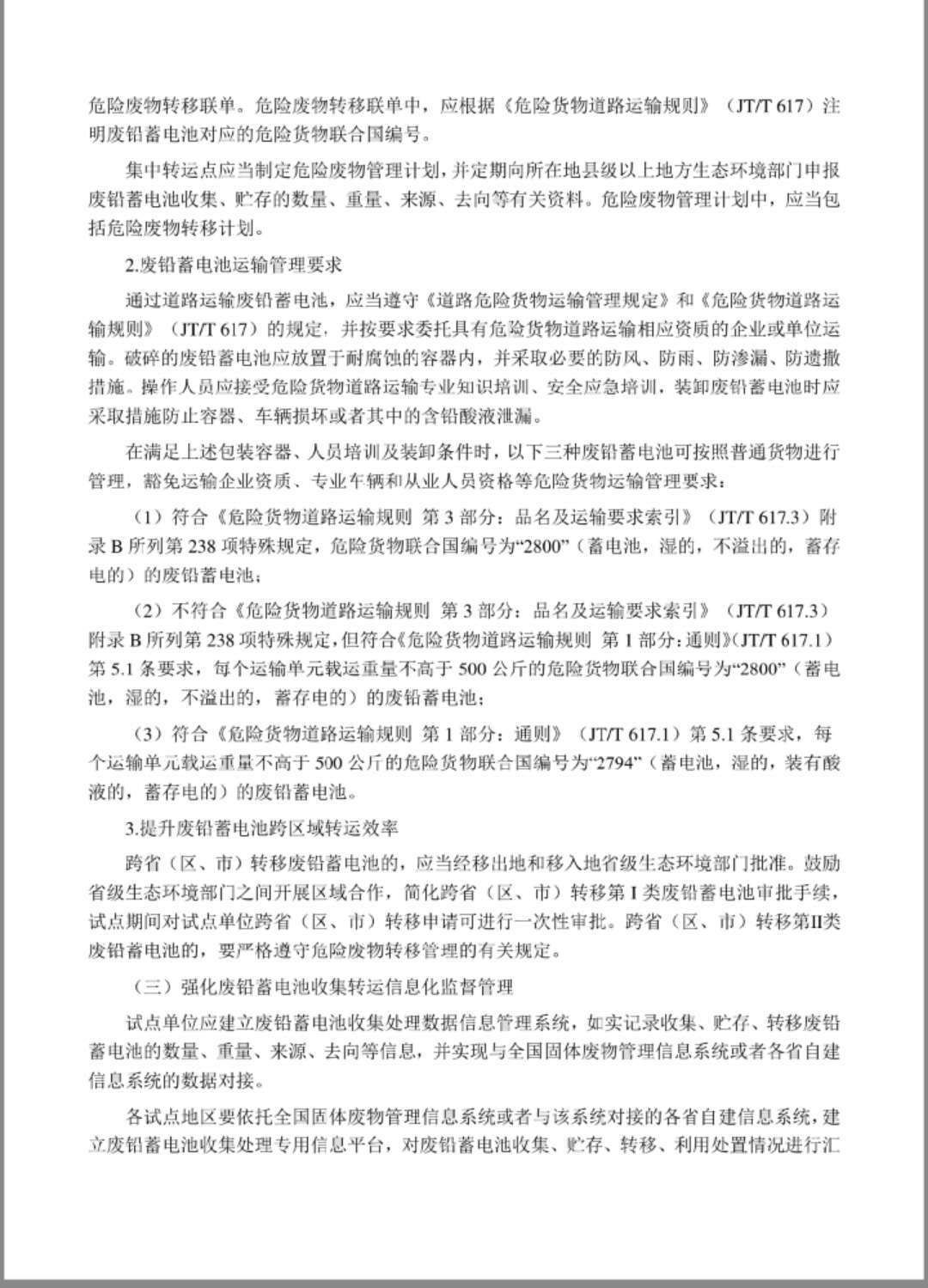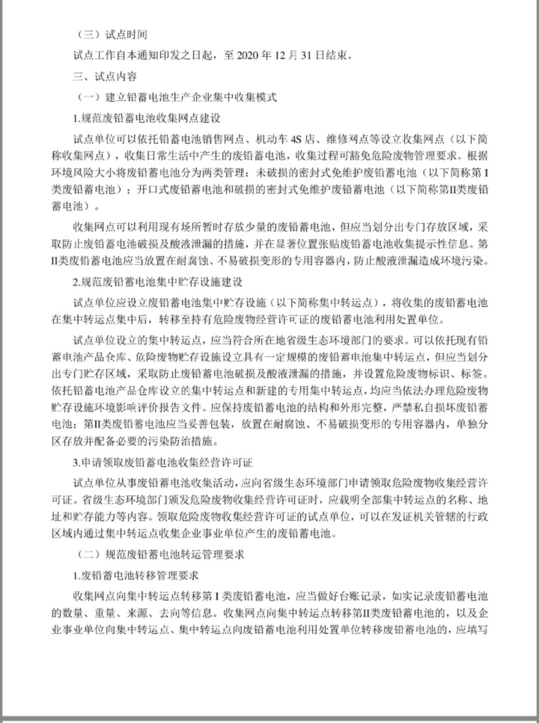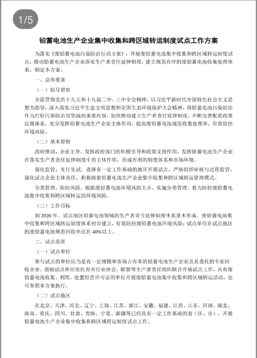 为落实《废铅蓄电池污染防治行动方案》有关要求,推动铅蓄电池生产企业落实生产者责任延伸制度,建立规范有序的废铅蓄电池收集处理体系,现将《铅蓄电池生产企业集中收集和跨区域转运制度试点工作方案》印发给你们,请认真组织落实。