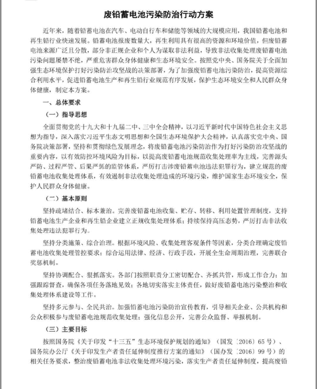 为加强废铅蓄电池污染防治,全面打好污染防治攻坚战,现将《废铅蓄电池污染防治行动方案》印发给你们,请认真落实要求,加快推进废铅蓄电池污染防治各项工作。